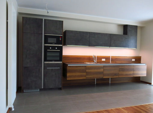 Facades: high-quality “Egger” (Austria) laminate with concrete decor and veneered, stained facade doors with a sloping diagonal texture.